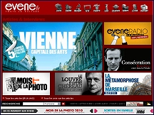 Chaque jour, découvrez sur Evene toute l'actualité culturelle; les événements à venir, les sorties musique, cinéma, littérature, la citation du jour, des quizz, les fêtes du jour... Participez activement au forum consacré à toutes les facettes de la vie culturelle avec plus de 2500 discussions, recevez la lettre Evene ou consultez la boutique en ligne pour des idées cadeaux très originales. Evene est un véritable média dédié entièrement à la culture, qui propose une multitude de contenus exclusifs de grande qualité comprenant plus de 2000 événements culturels (théâtre, danse, spectacle musical), près de 10.000 lieux culturels, plusieurs dizaines de milliers de livres, auteurs et célébrités, plus de 100.000 citations Evene et de nombreuses chroniques historiques, dans la partie cinéma d'Evene on trouve toutes les sorties de films à l'affiche, horaires et salles ainsi que des bandes annonces en vidéo et un annuaire de plus de 30.000 fiches complètes sur les films. Dans la catégorie livres de Evene on trouve tous les livres en fiches détaillées avec les critiques ainsi que les titres à paraître et le top des ventes, les 10 livres les plus vendus en France. Evene c'est aussi une tres importante galerie de photos et un répertoire d'artistes français; architectes, peintres, sculpteurs ou créateurs de la mode. Evene.fr est un portail gratuit soutenu activement par le Ministère français de la Culture et de la Communication et parrainé par l'écrivain et l'économiste Jacques Attali.